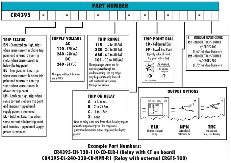 The CR4395 Series Current Sensing Relay provides an effective and highly stable method for monitoring electrical current. The current-carrying wire is routed through the opening extending from the top of the case. When current reaches the level set by the trip point adjustment, the relay trips and starts the adjustable timer. After the timer cycles the electromechanical relay is energized. A precision voltage reference circuit ensures a highly repeatable trip point. Design of the power-on delay circuitry allows the supply power to be repeatedly cycled on and off, without affecting the stability of the current sensing operation.