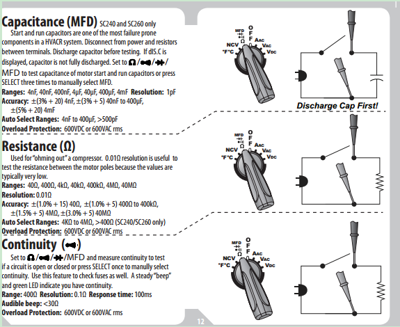The SC240 Compact Clamp Meter with Temperature packs a big punch in a compact meter. With features that rival many full-sized clamp meters, this auto ranging digital multimeter packs a ton of functions into a compact, easy to handle shape. It includes temperature in both Fahrenheit and Celsius, capacitance as well as non-contact voltage indicators. It also packs in most of the other HVACR ranges you use everyday. Some technicians use the SC240 as their everyday DMM, others as a back-up or second meter to get more testing done in less time. This compact HVACR clamp meter was deigned to make your job easier, safer, and faster no matter where you choose to rank it in your bag.