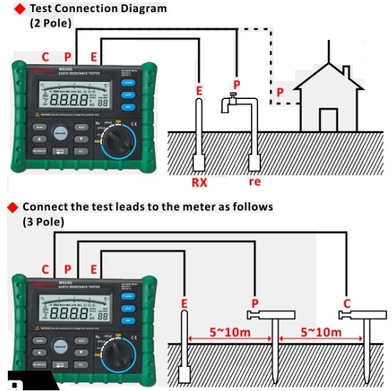 The meter is applicable to the testing of the earth resistance of the power supply wires, distribution wires inside a room, electrical equipment or appliance, which can done in two measurement modes: Bi-poles or Tri-poles, and it also can be used to measure the earth voltage.