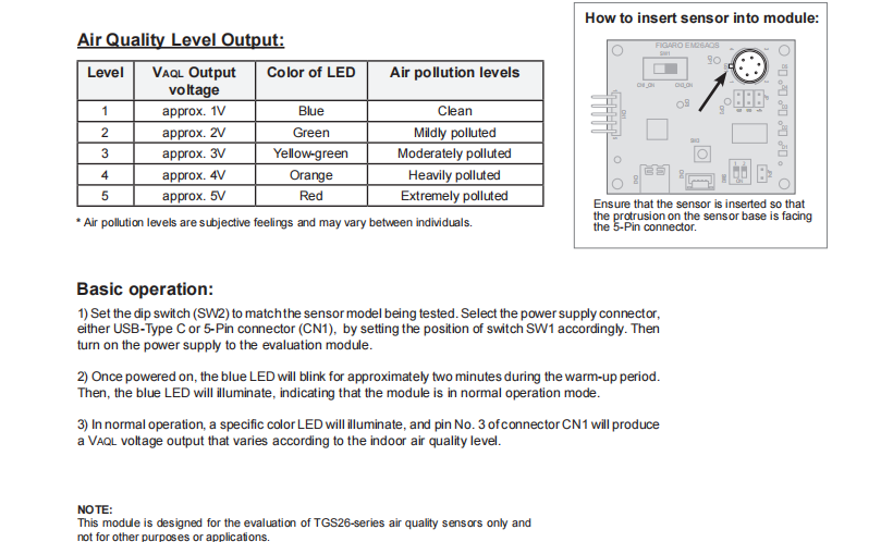 *2 The main function of this module is to convert output voltage of the sensor to indoor air quality level output and to provide LED indications without temperature compensation.
