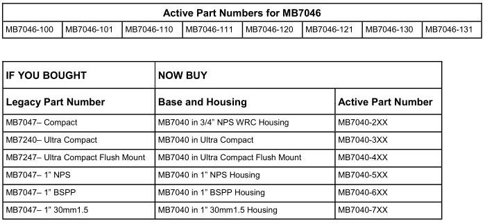 The legacy part numbers MB7047, MB7240 and MB7247 are now contained within MB7040 which is the base for all housing options on this product. To select a product with a legacy part number, select the desired housing option on the product with the appropriate base. Please review the following table for more information.