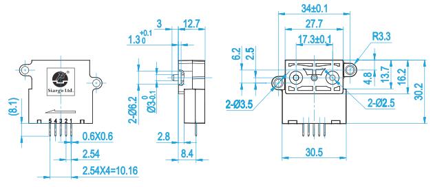 | Pins Out | 5 Pin, 2.54 mm centers, 0.635 mm square |