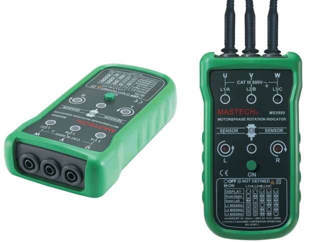Motor and Phase Rotation Indicator is a handheld, battery-operated instrument designed to detect the rotary field of three-phase systems and determine motor-rotation direction.