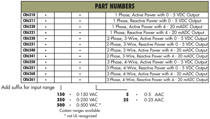 CR6210 AC Active Power Transducer PART NUMBERS