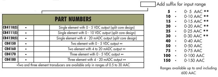 CR4110 True RMS AC Current Transducer PART NUMBERS