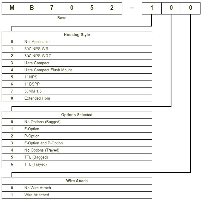 All part numbers are a combination of a six-character base followed by a dash and a three-digit product code. Please review the following table for more information on the three-digit product code.